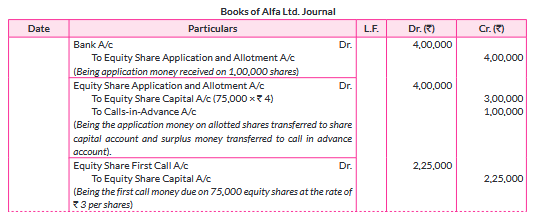 Alfa Ltd. invited applications for issuing 75,000 equity shares of $₹ 10$ each. The amount was payable as follows: