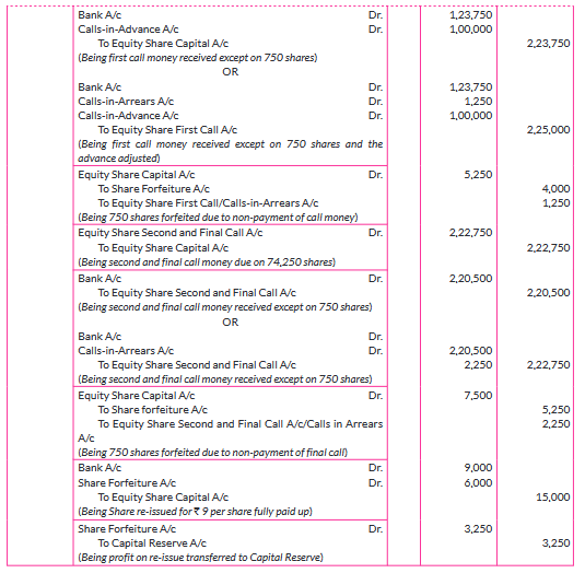 Application for $1,00,000$ shares were received. Shares were allotted to all the applicants on pro-rata basis and excess money received with applications was transferred towards sums due on first call. Vibha who was allotted 750 shares failed to pay the first call. Her shares were immediately forfeited. Afterwards the second call was made. The amount due on second call was also received except on 1000 shares, applied by Monika. Her shares were also forfeited. All the forfeited shares were re-issued to Mohit for ₹ 9,000 as fully paid up.
