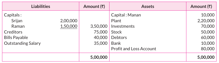 Srijan, Raman and Manan were partners in a firm sharing profits and losses in the ratio of 2 : 2 : 1. On 31st March, 2017, their Balance Sheet was as follows