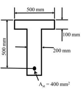 The cross-section of the reinforced concrete beam having an effective depth of $500 \mathrm{~mm}$ is shown in the figure (not drawn to the scale). The grades of concrete and steel used are $\mathrm{M} 35$ and Fe550, respectively. The area of tension reinforcement is $400 \mathrm{~mm}^{2}$. It is given that corresponding to $0.2 \%$ proof stress, the material safety factor is 1.15 and the yield strain of Fe 550 steel is 0.0044 .