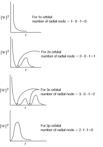 The graphs between $|\psi|^2$ and $r$ are radial density plots having $(n-l-1)$ number of radial nodes. For $1 s, 2 s, 3 s$ and $2 p$-orbitals these are respectively.