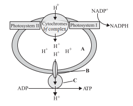 Identify the parts marked as $A, B$ and $C$ in the given figure showing ATP synthesis through chemiosmosis.