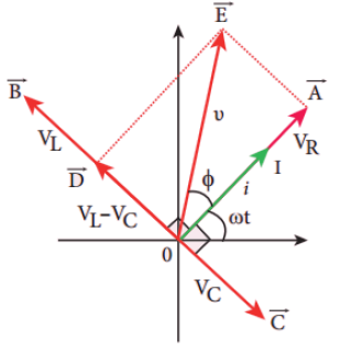 The circuit is cither effectively inductive or capacitive or resistive that depends on the value of $V_1$ or $\mathrm{V}_{\mathrm{c}}$ Let us assume that $\mathrm{V}_{\mathrm{L}}>\mathrm{V}_{\mathrm{C}}$. so that net voltage drop across $\mathrm{L}-\mathrm{C}$ combination is $\mathrm{V}_{\mathrm{L}}<\mathrm{V}_{\mathrm{C}}$ which is represented by a phasor $\overrightarrow{A D}$.