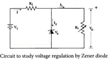 output voltage even when input voltage $\mathrm{V}_{\mathrm{i}}$ or load current $\mathrm{I}_{\mathrm{L}}$ varies. Here, in this circuit the input voltage $\mathrm{V}_{\mathrm{i}}$ is regulated at a constant voltage, $\mathrm{V}_{\mathrm{z}}$ (Zener voltage) at the output represented as $\mathrm{V}_0$ using a Zener diode. The output voltage is maintained constant as long as the input voltage does not fall below $\mathrm{Z}_{\mathrm{z}}$