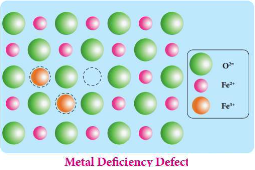 Metal deficiency defect arises due to the presence of less number of cations than the anions. This defect is observed in a crystal in which, the cations have variable oxidation states. For example, in $\mathrm{FeO}$ crystal, some of the $\mathrm{Fe}^{2+}$ ions are missing from the crystal lattice.