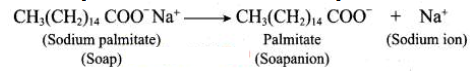 3. In water a sodium soap dissolves to form soap anions and sodium cations. For example, the following chemical equation shows the ionisation of sodium palmitate.