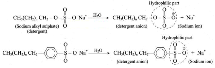 5. In water, detergent dissolves to form detergent anions and sodium cations. For example the following chemical equations show the ionisation of sodium alkyl sulphate and sodium alkyl benzene sulphate.